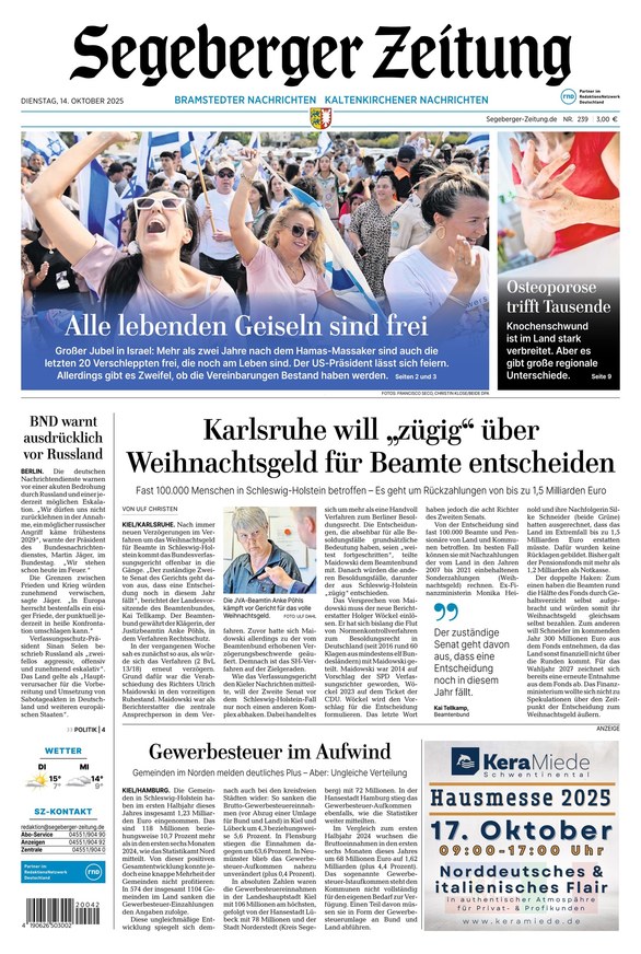 Die Segeberger Zeitung berichtet als Lokalzeitung vorwiegend über alle aktuellen Geschehnisse aus dem Kreis Segeberg in Schleswig-Holstein, informiert aber auch über überregionale Nachrichten. Weiterlesen...