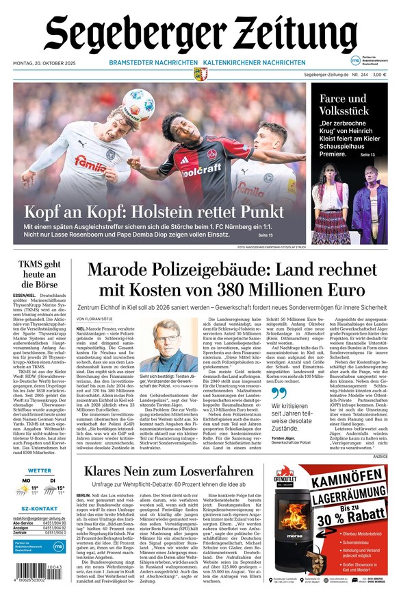 Die Segeberger Zeitung berichtet als Lokalzeitung vorwiegend über alle aktuellen Geschehnisse aus dem Kreis Segeberg in Schleswig-Holstein, informiert aber auch über überregionale Nachrichten. Weiterlesen...
