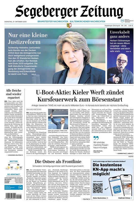Die Segeberger Zeitung berichtet als Lokalzeitung vorwiegend über alle aktuellen Geschehnisse aus dem Kreis Segeberg in Schleswig-Holstein, informiert aber auch über überregionale Nachrichten. Weiterlesen...