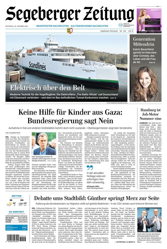 Die Segeberger Zeitung berichtet als Lokalzeitung vorwiegend über alle aktuellen Geschehnisse aus dem Kreis Segeberg in Schleswig-Holstein, informiert aber auch über überregionale Nachrichten. Weiterlesen...