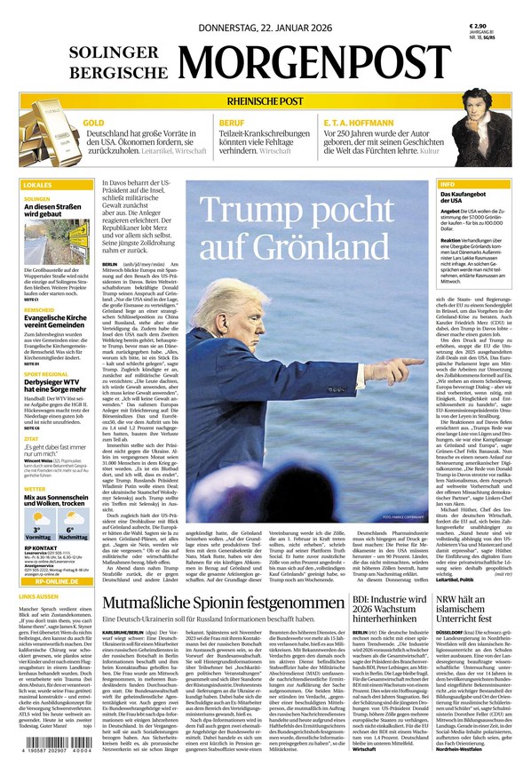 Die Solinger Morgenpost ist ein Teil der Rheinischen Post und konzentriert sich auf die Berichterstattung aus dem Land Nordrhein-Westfalen, bringt aber auch nationale und internationale Meldungen. Weiterlesen...