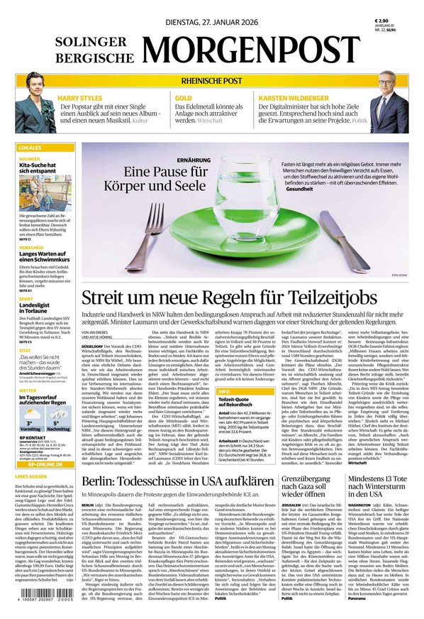 Die Solinger Morgenpost ist ein Teil der Rheinischen Post und konzentriert sich auf die Berichterstattung aus dem Land Nordrhein-Westfalen, bringt aber auch nationale und internationale Meldungen. Weiterlesen...