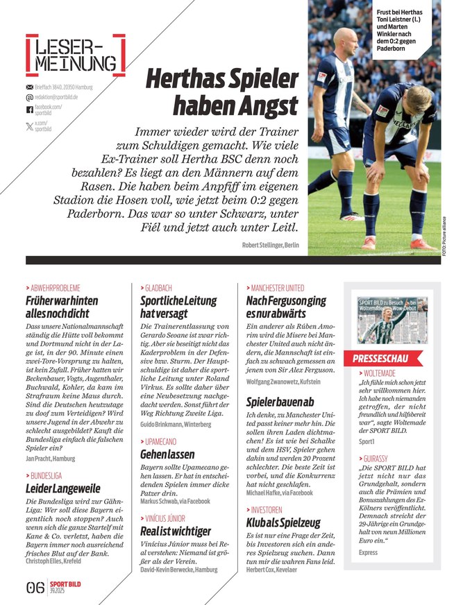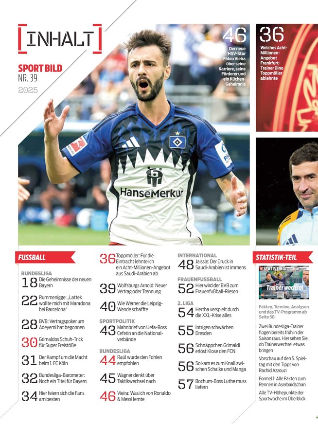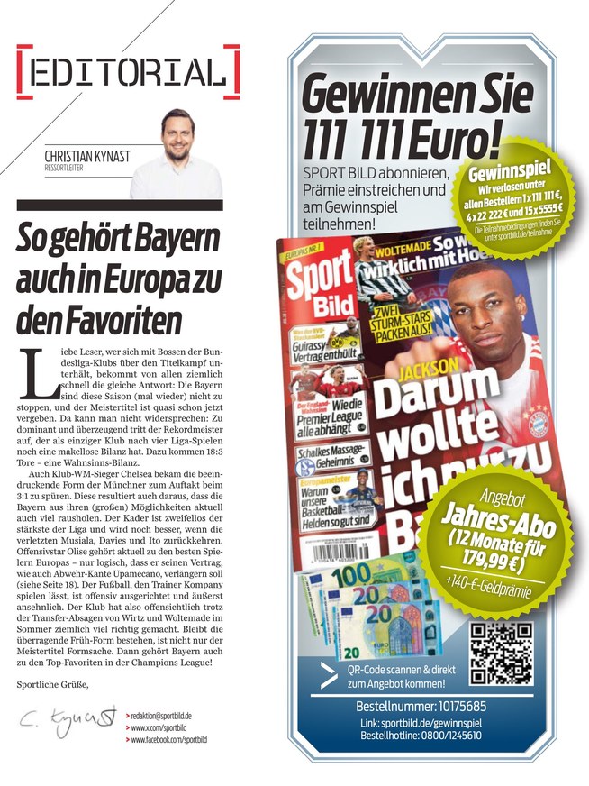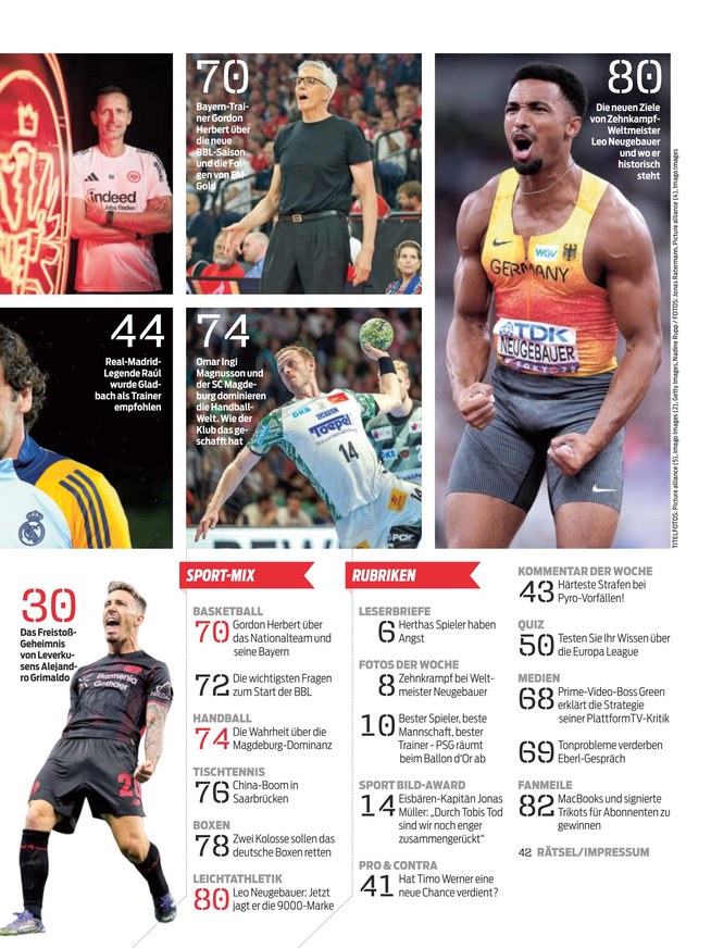 Die SPORT BILD, Europas Sportmagazin Nr. 1, berichtet über aktuelle Sportnachrichten rund um die Fußball-Bundesliga, Formel 1, Tennis und vieles mehr. Alle News finden Sie im ePaper der Zeitschrift Weiterlesen...