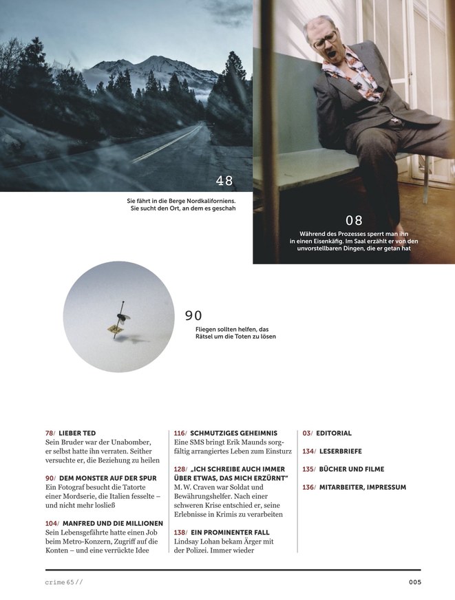 In der Rubrik "Bücher und Filme" berichten die Redakteure zudem regelmäßig über spannende Fundstücke aus der Film-, Fernseh- und Bücherwelt. Ob Dokumentation, Sachbuch oder spannende Geschichte, für Interessierte lohnt sich ein Blick. Ebenfalls spannend: Im Interview werden Star-Autoren und weitere interessante Persönlichkeiten zum Thema Krimi befragt. Im Schlussteil des Magazins kommt mit der Rubrik "Der prominente Fall“ eine abschließende Geschichte, in die sich Schauspieler oder andere Promis verstrickt haben.
