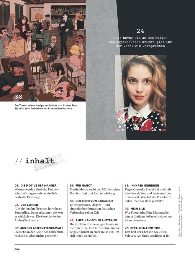 Nicht nur die Auflösung des Kriminalfalls kann in stern Crime gefunden werden, sondern auch das Schicksal dahinter. Warum wurde ein Mensch zum Täter, wie fühlt sich das Opfer und welche Spuren hat die Tat hinterlassen? Das und mehr will stern Crime herausfinden und widmet jeder Geschichte daher bis zu 10 Seiten und mehr. Im Fokus stehen bei den Recherchen keineswegs nur deutsche Verbrechen, sondern Fälle aus der ganzen Welt, die durch Brutalität, eine ungewöhnliche Vorgehensweise oder vielleicht auch ihr Strafmaß für Aufmerksamkeit gesorgt haben.