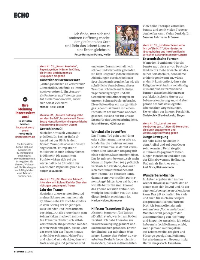 Das ePaper des Wochenmagazins Stern liefert Reportagen und spannende Hintergrundberichte zu aktuellen Themen aus Politik, Wirtschaft, Gesellschaft und Kultur. Weiterlesen...