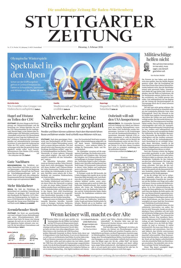 Alle Nachrichten aus Stuttgart und der Region erfahren Sie in der Stuttgarter Zeitung. Das ePaper setzt lokale Schwerpunkte, ist jedoch zusätzlich in der überregionalen Berichterstattung besonders stark. Weiterlesen...