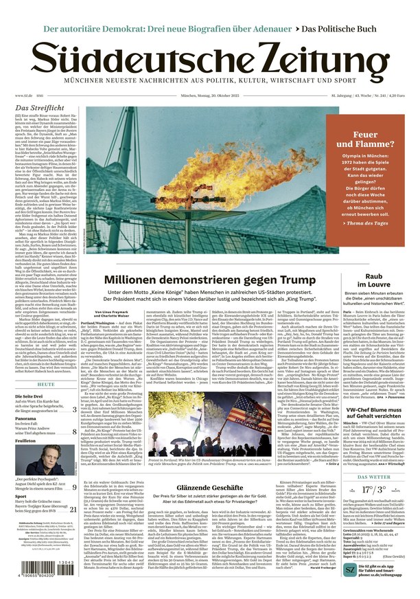 Die Süddeutsche Zeitung (SZ) liefert tagesaktuell Nachrichten und Hintergrundberichte aus Politik, Wirtschaft, Sport und Kultur. Das ePaper der Tageszeitung informiert Sie über alle relevanten News. Mit der Beilage des SZ Magazins am Freitag! Weiterlesen...