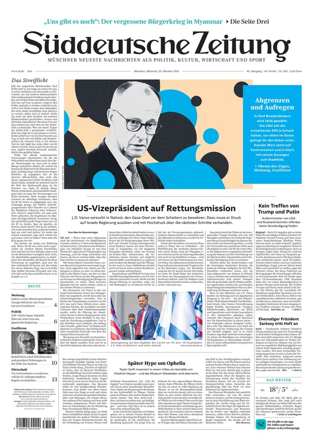 Die Süddeutsche Zeitung (SZ) liefert tagesaktuell Nachrichten und Hintergrundberichte aus Politik, Wirtschaft, Sport und Kultur. Das ePaper der Tageszeitung informiert Sie über alle relevanten News. Mit der Beilage des SZ Magazins am Freitag! Weiterlesen...