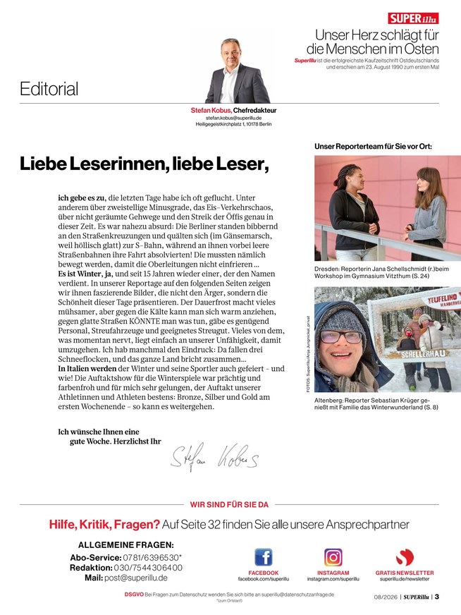 Die SUPERillu gilt als das "Sprachrohr des Ostens" und gehört seit nunmehr über 25 Jahren zu den beliebtesten Wochenzeitschriften in den neuen Bundesländern. Sowohl politische Themen werden in ihr behandelt als auch Themen, die insbesondere den Osten und die dortigen Menschen betreffen. Gleichzeitig finden Leser in der SUPERillu aber ebenfalls zahlreiche Themen, mit denen sich die Menschen aus den alten Bundesländern identifizieren können. Im iKiosk erhalten Sie die SUPERillu als praktisches ePaper, das Sie bequem auf Ihrem Smartphone oder Tablet lesen können - überall und jederzeit.