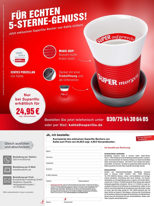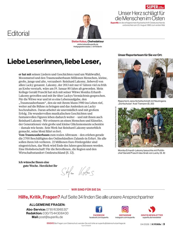 Die SUPERillu ist die Wochenzeitschrift für den Osten und liefert in jeder Ausgabe spannende News rund um Land und Leute, heimische Stars oder derzeit brisante Themen. Weiterlesen...