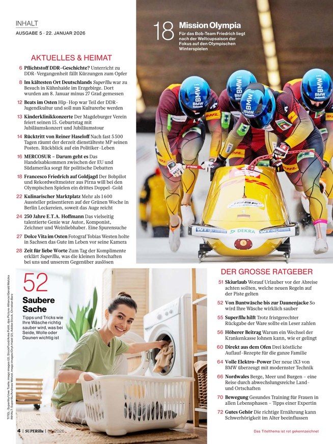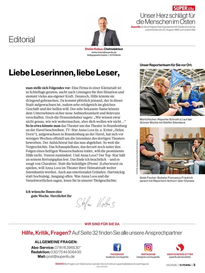 Die SUPERillu ist die Wochenzeitschrift für den Osten und liefert in jeder Ausgabe spannende News rund um Land und Leute, heimische Stars oder derzeit brisante Themen. Weiterlesen...