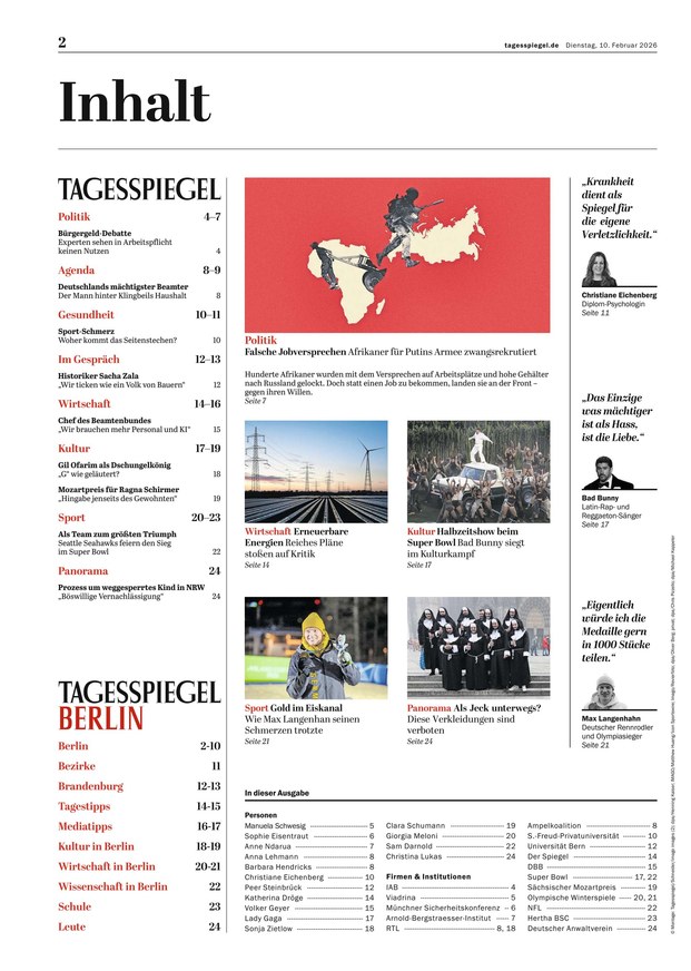 Mit der Rubrik „Fragen des Tages“ werden Lesende über aktuelle Fakten informiert, es folgt klassisch die Seite Drei, auf der sich die Redaktion ausführlich mit verschiedenen Themenbereichen auseinandersetzt. Von Lifestyle über Geographie bis Politik ist alles dabei. Dank dieser Vielfalt bietet der Tagesspiegel eine Quelle für Neugierige aller Lebensbereiche.