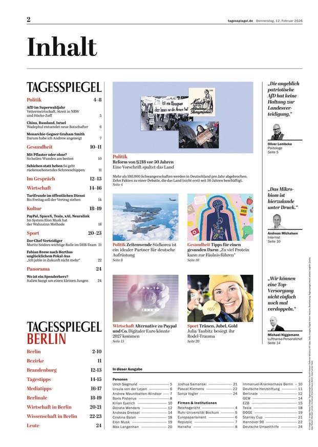 Mit der Rubrik „Fragen des Tages“ werden Lesende über aktuelle Fakten informiert, es folgt klassisch die Seite Drei, auf der sich die Redaktion ausführlich mit verschiedenen Themenbereichen auseinandersetzt. Von Lifestyle über Geographie bis Politik ist alles dabei. Dank dieser Vielfalt bietet der Tagesspiegel eine Quelle für Neugierige aller Lebensbereiche.