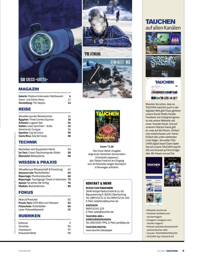 Besonders umfangreich ist die Kategorie Wissen, in der Sie die Rubriken Technik, Praxis, Multimedia und Forum mit Leserfoto-Voting, Expertenrunde und Leserbriefen finden. TAUCHEN ist eine Zeitschrift mit langjähriger Tradition, die nicht nur durch die Veröffentlichung als ePaper fest in der Moderne verwurzelt ist. Die Redaktion nimmt zukunftsträchtige Trends und innovative Methoden bzw. Techniken auf und beleuchtet diese kritisch. Herausgegeben wird das Magazin, das erstmals im Jahre 1978 erschien, von der JAHR Artopé MEDIA GmbH & Co. KG.