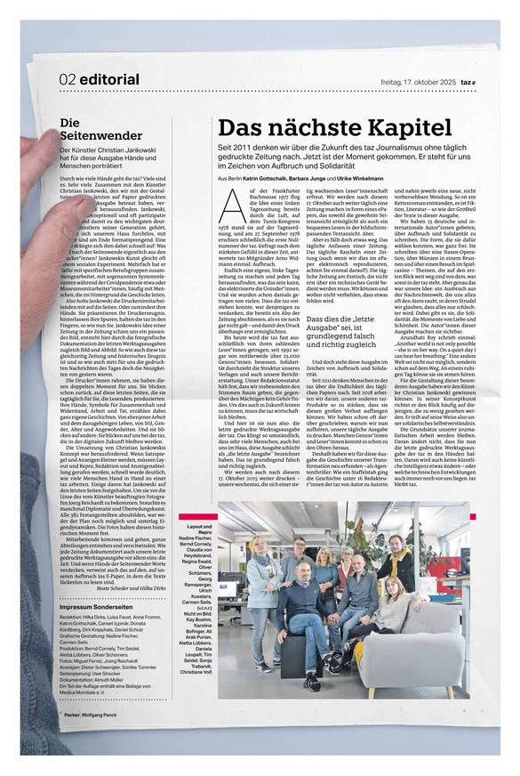 Der taz ist keine Wahrheit zu unbequem. Kritische Recherchen, Kommentare und Interviews machen die Berichterstattung der überregionalen Tageszeitung aus. Printausgabe und ePaper der taz erscheinen von Montag bis Samstag, am siebten Tag der Woche wird eine eigene Sonntagszeitung taz am Wochenende herausgegeben.