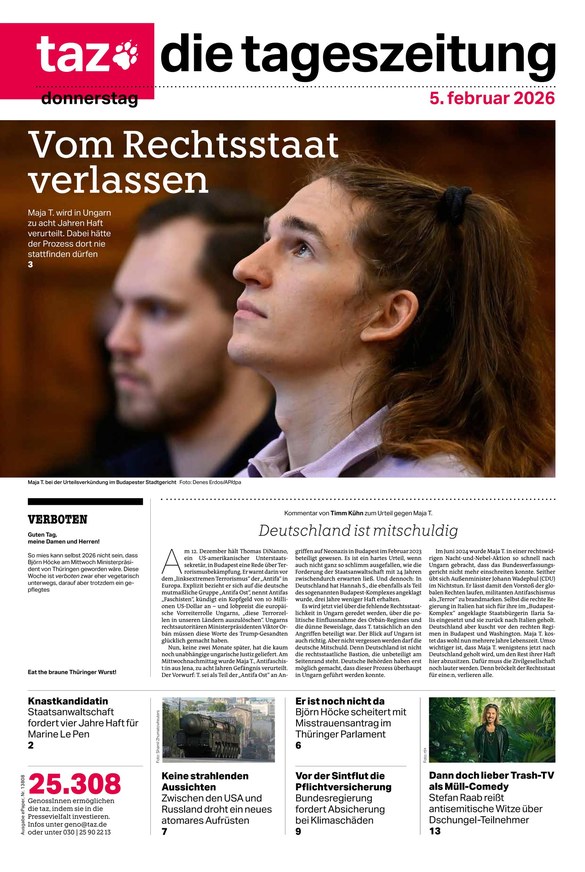 Von Politik über Wirtschaft und Gesellschaft bis hin zum Sport - taz die tageszeitung informiert Sie im ePaper über aktuelle Themen aus Deutschland und der ganzen Welt. Weiterlesen...