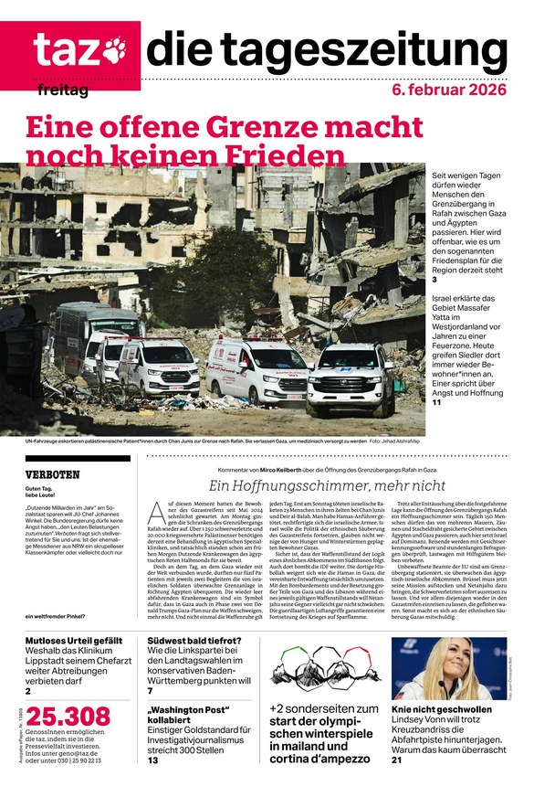 Von Politik über Wirtschaft und Gesellschaft bis hin zum Sport - taz die tageszeitung informiert Sie im ePaper über aktuelle Themen aus Deutschland und der ganzen Welt. Weiterlesen...