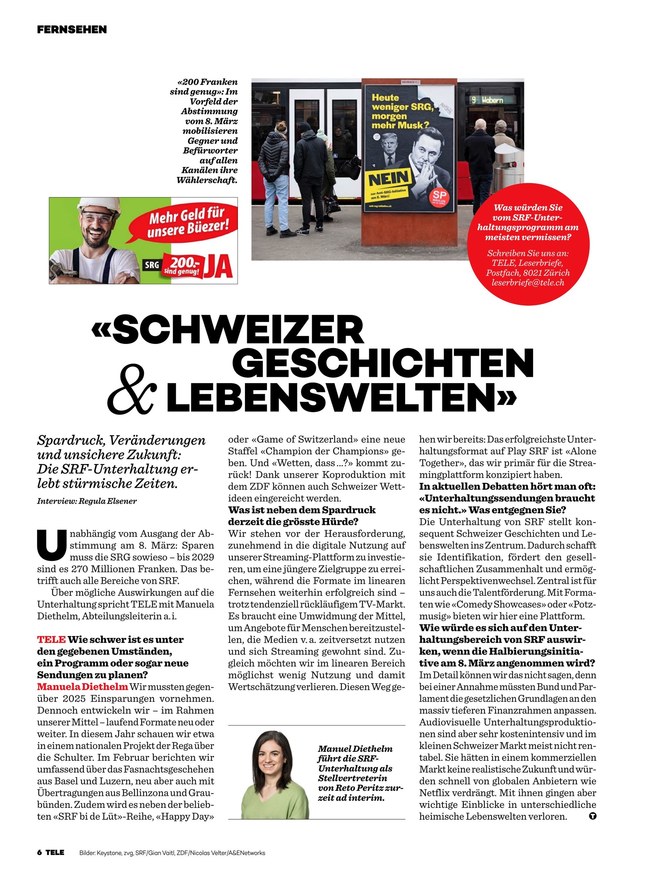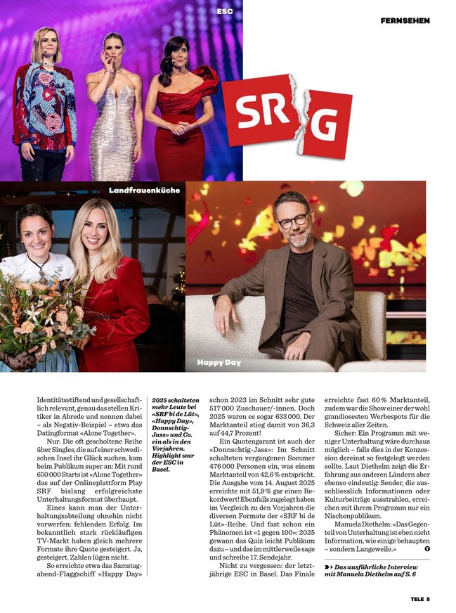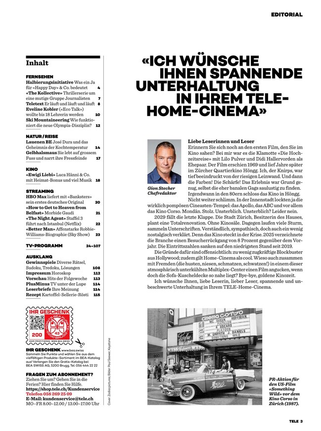 TELE ist das TV-Magazin der Schweiz. Das ePaper informiert über das aktuelle TV-Programm und berichtet über aktuelle Themen aus Bereichen wie Unterhaltung, Kino und Reise. Weiterlesen...