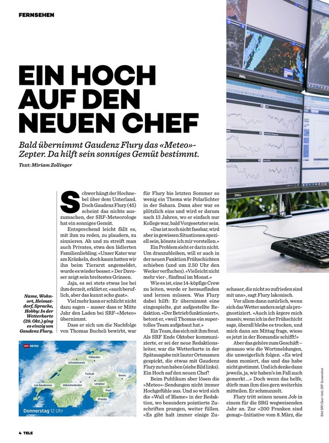 TELE ist das TV-Magazin der Schweiz. Das ePaper informiert über das aktuelle TV-Programm und berichtet über aktuelle Themen aus Bereichen wie Unterhaltung, Kino und Reise. Weiterlesen...
