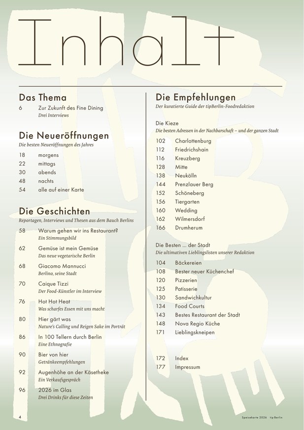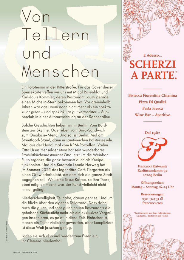 Micaela Longo, Gastgeberin im charmanten ITA Bistro am Helmholtzplatz, spricht in dieser tipBerlin-Speisekarte von den drei P: Products, People, Planet. Für sie bilden diese Aspekte die Grundlage zeitgemäßer Kulinarik: erstklassige, handwerklich hergestellte und möglichst regionale Lebensmittel; ein respektvoller Umgang zwischen Mitarbeiter:innen, Produzent:innen und Gästen; sowie ein Bewusstsein für unseren ökologischen Fußabdruck. Wir möchten zwei A hinzufügen: Aromen und Atmosphäre. Restaurants und Wirtshäuser, in denen Tische wieder großzügig gedeckt sind – mit Gerichten, die weniger auf avantgardistische Perfektion setzen als darauf, Erwartungen zu erfüllen und dabei sogar zu übertreffen. Es geht um die beste Wohlfühlküche, die diese Stadt zu bieten hat. Ob in einem Ballhaus, einem legendären Ausflugslokal oder einer japanischen Kneipe. Und schließlich noch ein H: Herzhaftigkeit. Clemens Roesch, Gastgeber im Neo-Wirtshaus Trio, bringt diese nicht nur auf den Teller, sondern auch in den Gastraum. In diesem Sinne: Auf ein herzhaftes 2025, immer in bester Tischgesellschaft – und bleiben Sie hungrig!