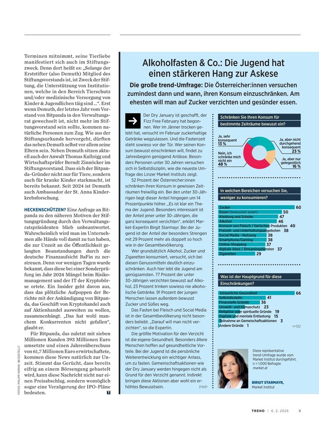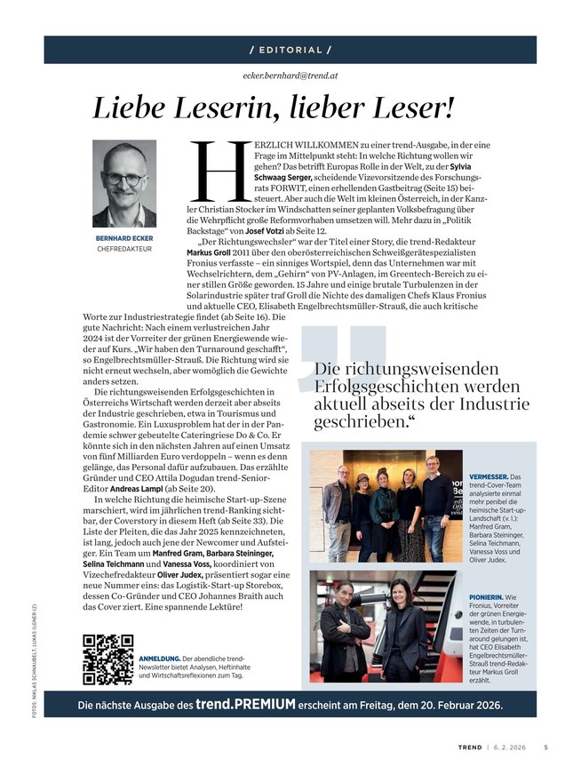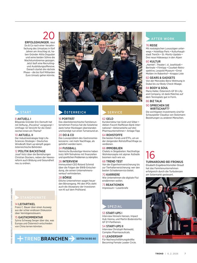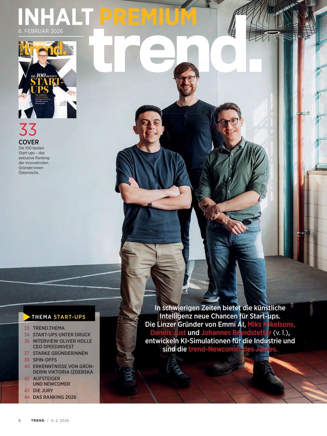 Lesen Sie jetzt die neueste Ausgabe der trend als praktisches ePaper oder laden Sie sich das Magazin als PDF auf Ihr Endgerät herunter. So können Sie ganz entspannt daheim oder auch unterwegs auf Ihrem Smartphone oder Tablet lesen. Sie suchen nach einer älteren Ausgabe? Dann werfen Sie einfach einen Blick in unser Archiv.