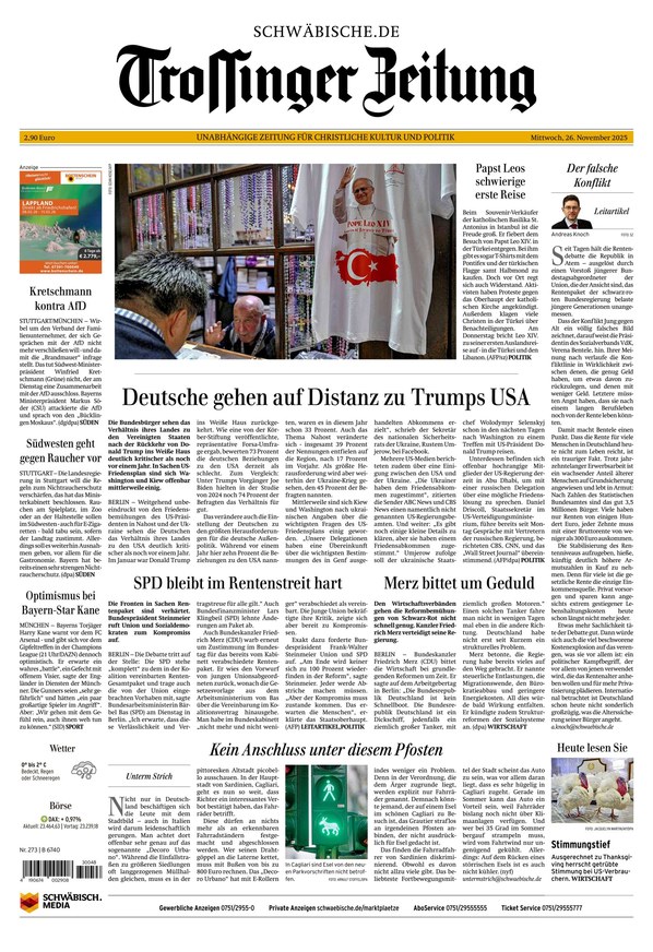 Die Trossinger Zeitung berichtet als lokale Tageszeitung täglich über alle Themen, die in der Region und darüber hinaus wichtig sind. Bleiben Sie mit dem ePaper über alle Nachrichten aus dem Süden informiert. Weiterlesen...