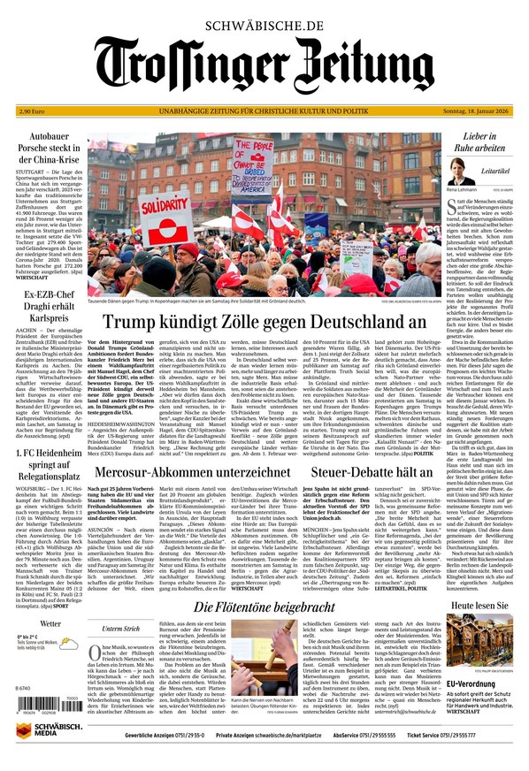 Als Lokalausgabe der Schwäbischen Zeitung erscheint die Trossinger Zeitung von Montag bis Samstag als ePaper. Die "Unabhängige Zeitung für christliche Kultur und Politik" berichtet über alle News aus Trossingen, Villingen-Schwenningen, Elta, Baar, Primtal, Heuberg und Spaichingen. Was im Kreis und in der Region wichtig ist, erfahren Sie täglich im ePaper der Trossinger Zeitung. Sie können die digitale Ausgabe Ihrer lokalen Tageszeitung nicht nur auf dem Smartphone, Tablet oder am Computer lesen, sondern auch als PDF herunterladen.