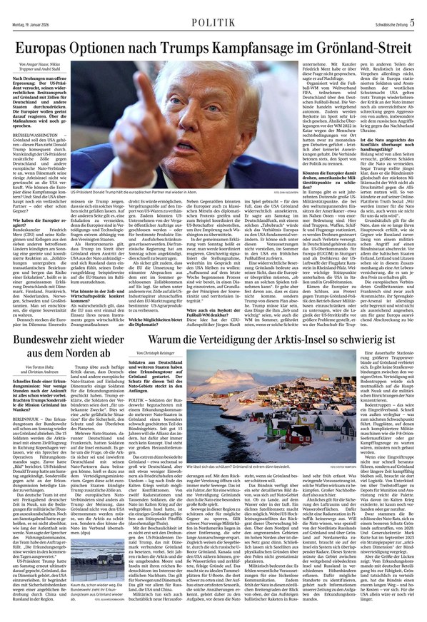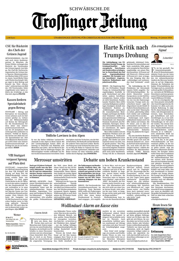 Als Lokalausgabe der Schwäbischen Zeitung erscheint die Trossinger Zeitung von Montag bis Samstag als ePaper. Die "Unabhängige Zeitung für christliche Kultur und Politik" berichtet über alle News aus Trossingen, Villingen-Schwenningen, Elta, Baar, Primtal, Heuberg und Spaichingen. Was im Kreis und in der Region wichtig ist, erfahren Sie täglich im ePaper der Trossinger Zeitung. Sie können die digitale Ausgabe Ihrer lokalen Tageszeitung nicht nur auf dem Smartphone, Tablet oder am Computer lesen, sondern auch als PDF herunterladen.