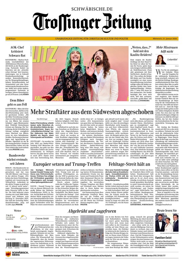 Als Lokalausgabe der Schwäbischen Zeitung erscheint die Trossinger Zeitung von Montag bis Samstag als ePaper. Die "Unabhängige Zeitung für christliche Kultur und Politik" berichtet über alle News aus Trossingen, Villingen-Schwenningen, Elta, Baar, Primtal, Heuberg und Spaichingen. Was im Kreis und in der Region wichtig ist, erfahren Sie täglich im ePaper der Trossinger Zeitung. Sie können die digitale Ausgabe Ihrer lokalen Tageszeitung nicht nur auf dem Smartphone, Tablet oder am Computer lesen, sondern auch als PDF herunterladen.