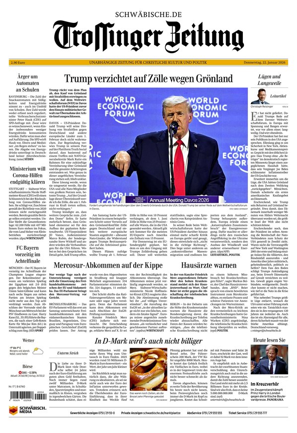 Die Trossinger Zeitung berichtet als lokale Tageszeitung täglich über alle Themen, die in der Region und darüber hinaus wichtig sind. Bleiben Sie mit dem ePaper über alle Nachrichten aus dem Süden informiert. Weiterlesen...