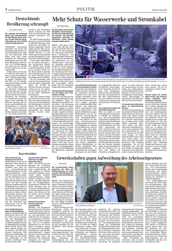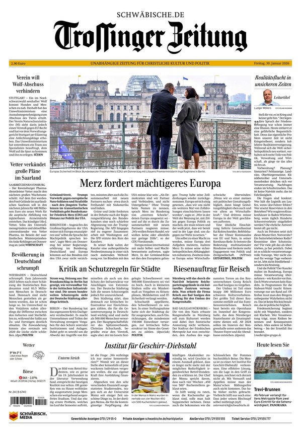 Als Lokalausgabe der Schwäbischen Zeitung erscheint die Trossinger Zeitung von Montag bis Samstag als ePaper. Die "Unabhängige Zeitung für christliche Kultur und Politik" berichtet über alle News aus Trossingen, Villingen-Schwenningen, Elta, Baar, Primtal, Heuberg und Spaichingen. Was im Kreis und in der Region wichtig ist, erfahren Sie täglich im ePaper der Trossinger Zeitung. Sie können die digitale Ausgabe Ihrer lokalen Tageszeitung nicht nur auf dem Smartphone, Tablet oder am Computer lesen, sondern auch als PDF herunterladen.