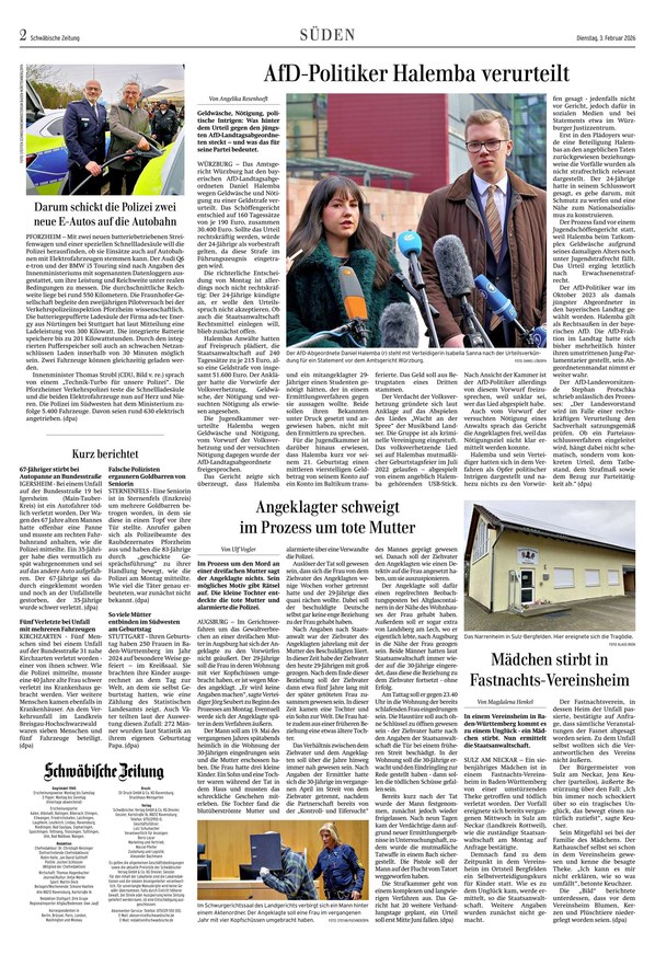 Als Lokalausgabe der Schwäbischen Zeitung erscheint die Trossinger Zeitung von Montag bis Samstag als ePaper. Die "Unabhängige Zeitung für christliche Kultur und Politik" berichtet über alle News aus Trossingen, Villingen-Schwenningen, Elta, Baar, Primtal, Heuberg und Spaichingen. Was im Kreis und in der Region wichtig ist, erfahren Sie täglich im ePaper der Trossinger Zeitung. Sie können die digitale Ausgabe Ihrer lokalen Tageszeitung nicht nur auf dem Smartphone, Tablet oder am Computer lesen, sondern auch als PDF herunterladen.