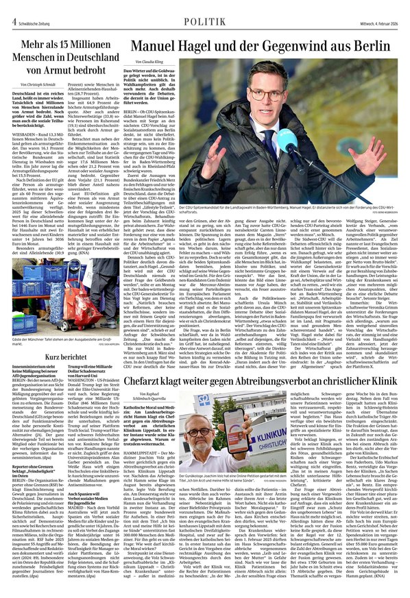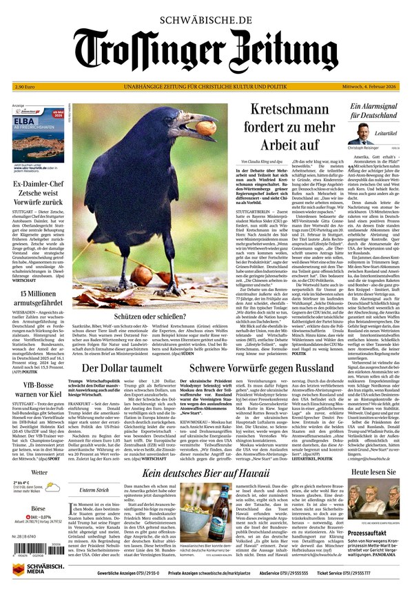 Als Lokalausgabe der Schwäbischen Zeitung erscheint die Trossinger Zeitung von Montag bis Samstag als ePaper. Die "Unabhängige Zeitung für christliche Kultur und Politik" berichtet über alle News aus Trossingen, Villingen-Schwenningen, Elta, Baar, Primtal, Heuberg und Spaichingen. Was im Kreis und in der Region wichtig ist, erfahren Sie täglich im ePaper der Trossinger Zeitung. Sie können die digitale Ausgabe Ihrer lokalen Tageszeitung nicht nur auf dem Smartphone, Tablet oder am Computer lesen, sondern auch als PDF herunterladen.