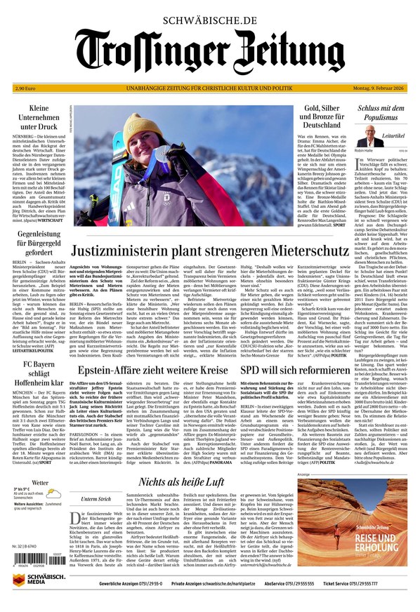 Die Trossinger Zeitung berichtet als lokale Tageszeitung täglich über alle Themen, die in der Region und darüber hinaus wichtig sind. Bleiben Sie mit dem ePaper über alle Nachrichten aus dem Süden informiert. Weiterlesen...
