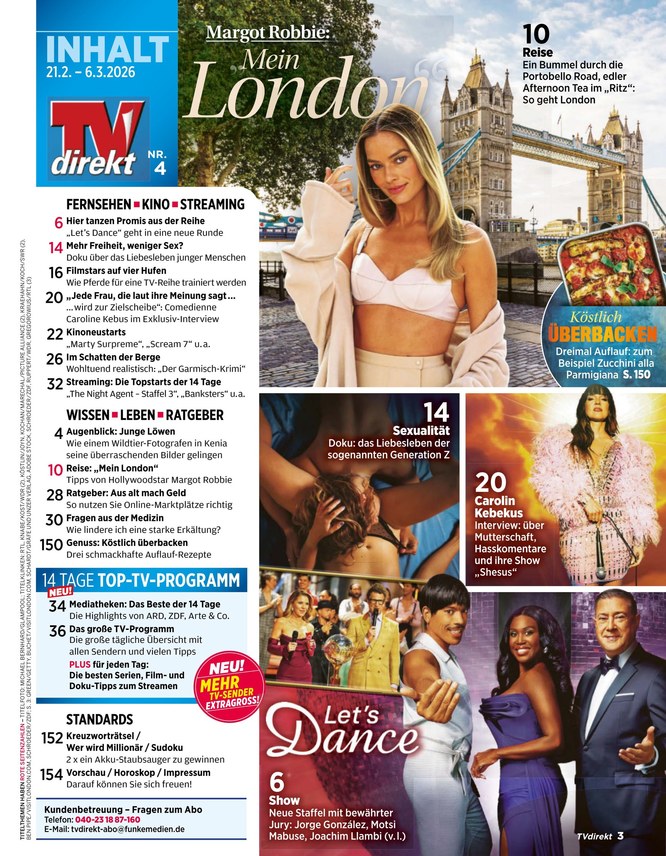 Mit TVdirekt erhalten Sie das volle Free-TV-Programm für 14 Tage. Die Fernsehprogrammzeitschrift geht inhaltlich jedoch weit über reine Programmankündigungen hinaus: Die Redaktion bewertet Highlights und informiert über spannende Service- und Ratgeberthemen. Praktisch: Das ePaper von TVdirekt können Sie online im iKiosk lesen oder als PDF herunterladen.