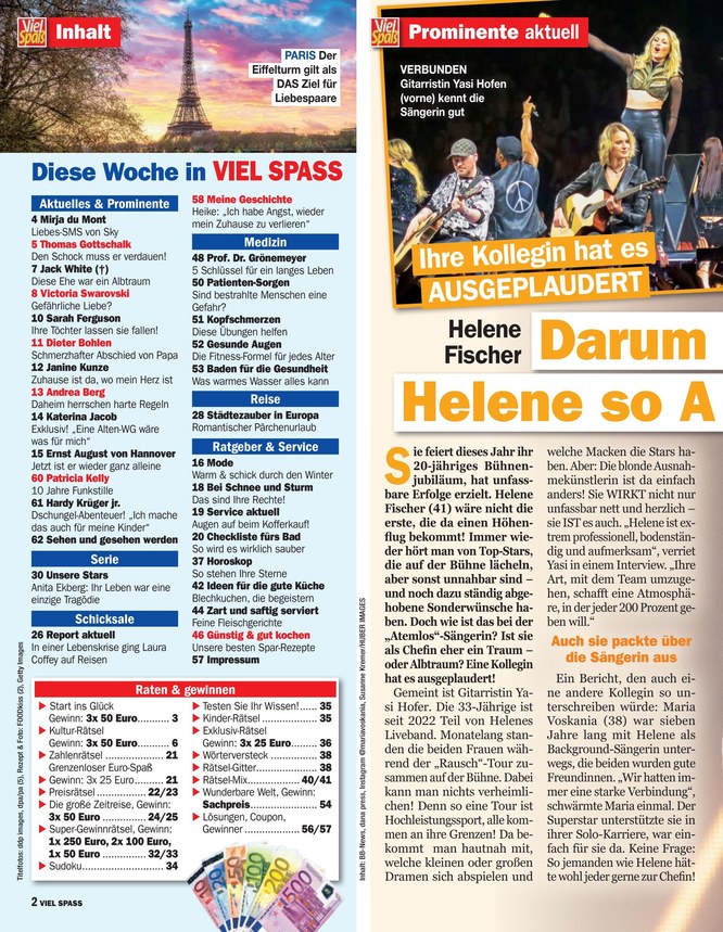 Als junges Magazin bietet VIEL SPAß Woche für Woche alles, was die Leserin braucht. Jede Menge aktuelle Geschichten und News aus der Welt der deutschen Stars, sowie Geschichten und Schicksale mitten aus dem Leben, bieten beste Unterhaltung und Abwechslung. Weiterlesen...