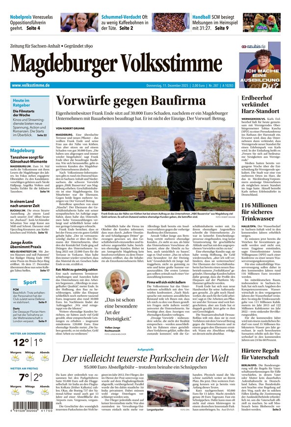 Als regionale Tageszeitung konzentriert sich die Volksstimme vor allem auf den Norden Sachsen-Anhalts. Tagesaktuelle Nachrichten aus Deutschland und der Welt ergänzen die regionale Berichterstattung. Neben Wirtschaftsnachrichten berichtet die Volksstimme über alle wichtigen politischen Entscheidungen. Ein kompetent recherchierter Ratgeberteil rundet das ePaper der Volksstimme ab – Leserinnen und Leser profitieren von fundierten Tipps rund um die Themen Gesundheit, Verbraucherschutz und Finanzen