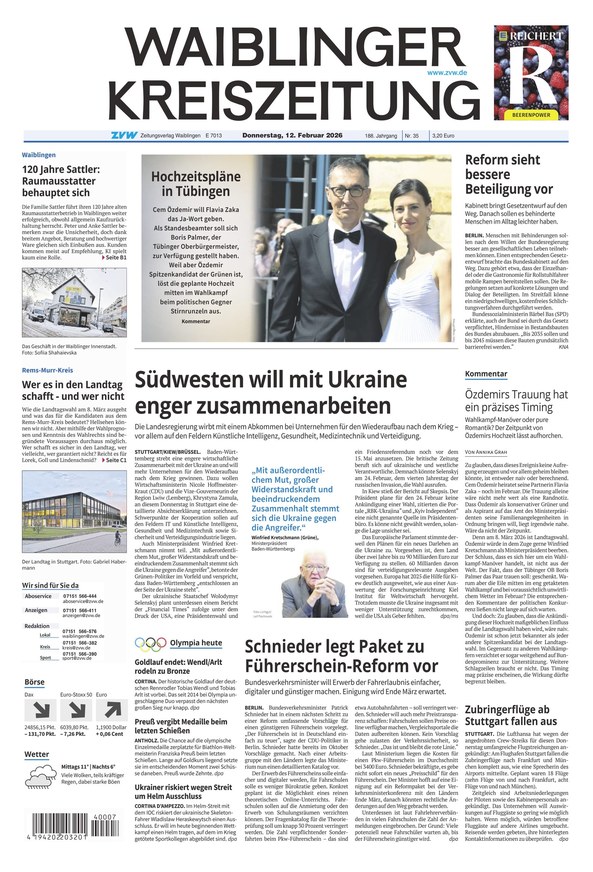 Im Rems-Murr-Kreis ist die Waiblinger Kreiszeitung eine der wohl wichtigsten Informationsquellen und berichtet in täglichen Artikeln über die Region und lokale Geschehnisse. Weiterlesen...
