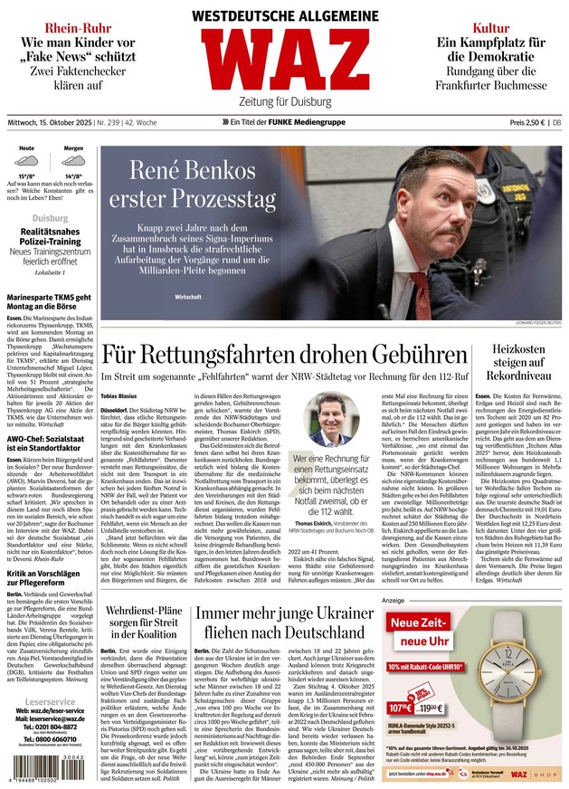 Die Westdeutsche Allgemeine Zeitung (WAZ) liefert brandaktuelle Nachrichten aus den Bereichen Politik, Wirtschaft, Kultur und Sport. Im ePaper finden Sie zudem regionale News aus Nordrhein-Westfalen. Weiterlesen...