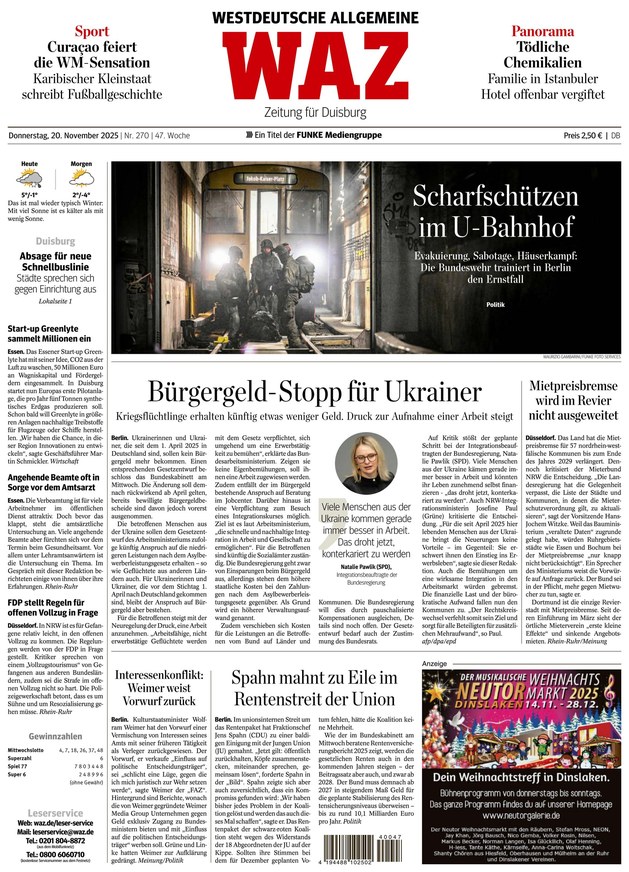 Die Westdeutsche Allgemeine Zeitung (WAZ) liefert brandaktuelle Nachrichten aus den Bereichen Politik, Wirtschaft, Kultur und Sport. Im ePaper finden Sie zudem regionale News aus Nordrhein-Westfalen. Weiterlesen...