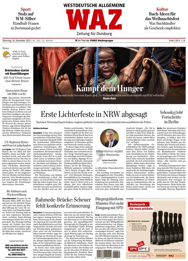 Die Westdeutsche Allgemeine Zeitung (WAZ) liefert brandaktuelle Nachrichten aus den Bereichen Politik, Wirtschaft, Kultur und Sport. Im ePaper finden Sie zudem regionale News aus Nordrhein-Westfalen. Weiterlesen...