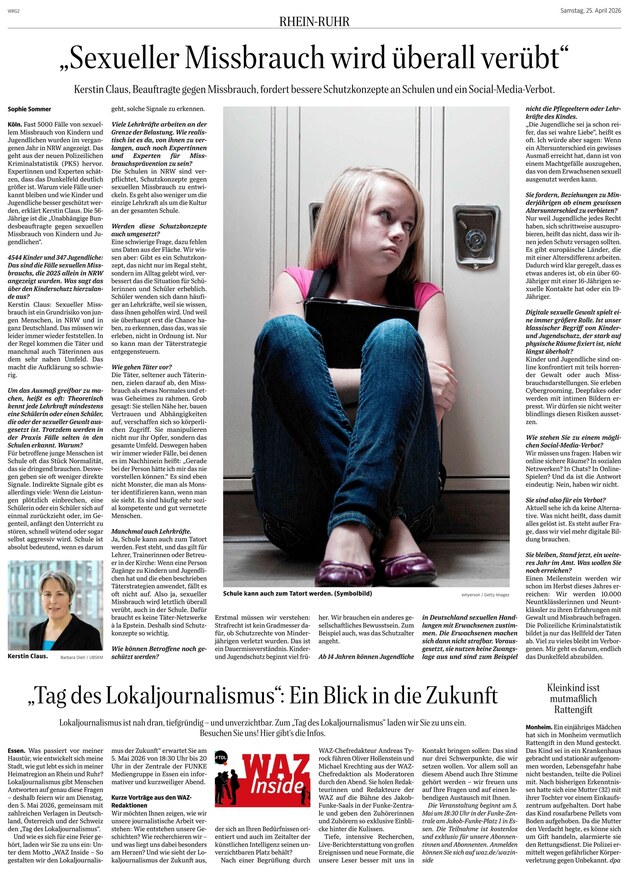 Die WAZ ist vor Ort präsent und punktet entsprechend durch lokale Kompetenz. Die Inhalte für die bereits erwähnten Ausgaben der WAZ werden in mehr als 30 Lokalredaktionen konzipiert und erstellt. Unabhängige Berichterstattung und sorgfältige Recherche sorgen dafür, dass Sie sich auf die WAZ als zuverlässige und vertrauenswürdige Informationsquelle verlassen können. Die lokalen Redaktionen befinden sich allesamt in Nordrhein-Westfalen. Berichtet wird tagesaktuell aus zahlreichen Ressorts. Ein deutlicher Schwerpunkt liegt auf der regionalen Berichterstattung, die WAZ verfügt über einen umfassenden Sport- und Lokalteil. Unter anderem gibt es in der WAZ folgende Rubriken: