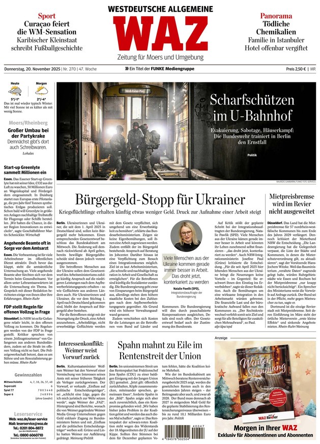 Die Westdeutsche Allgemeine Zeitung (WAZ) liefert brandaktuelle Nachrichten aus den Bereichen Politik, Wirtschaft, Kultur und Sport. Im ePaper finden Sie zudem regionale News aus Nordrhein-Westfalen. Weiterlesen...