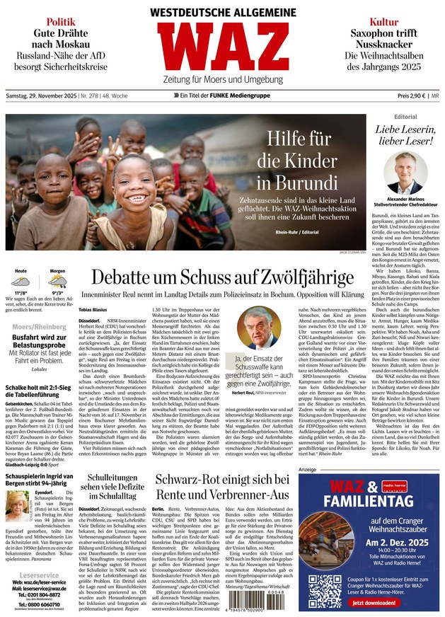Die Westdeutsche Allgemeine Zeitung (WAZ) liefert brandaktuelle Nachrichten aus den Bereichen Politik, Wirtschaft, Kultur und Sport. Im ePaper finden Sie zudem regionale News aus Nordrhein-Westfalen. Weiterlesen...