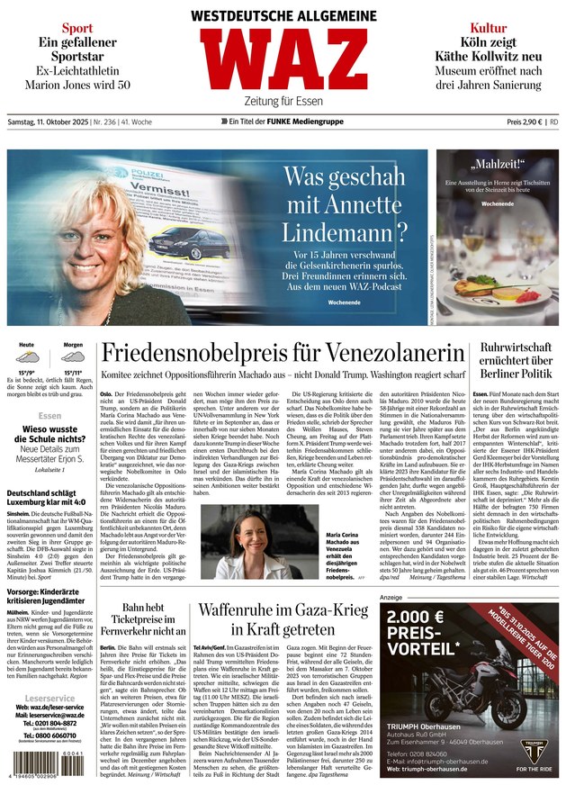 Die Westdeutsche Allgemeine Zeitung (WAZ) liefert brandaktuelle Nachrichten aus den Bereichen Politik, Wirtschaft, Kultur und Sport. Im ePaper finden Sie zudem regionale News aus Nordrhein-Westfalen. Weiterlesen...