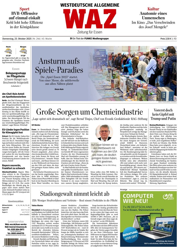 Die Westdeutsche Allgemeine Zeitung (WAZ) liefert brandaktuelle Nachrichten aus den Bereichen Politik, Wirtschaft, Kultur und Sport. Im ePaper finden Sie zudem regionale News aus Nordrhein-Westfalen. Weiterlesen...