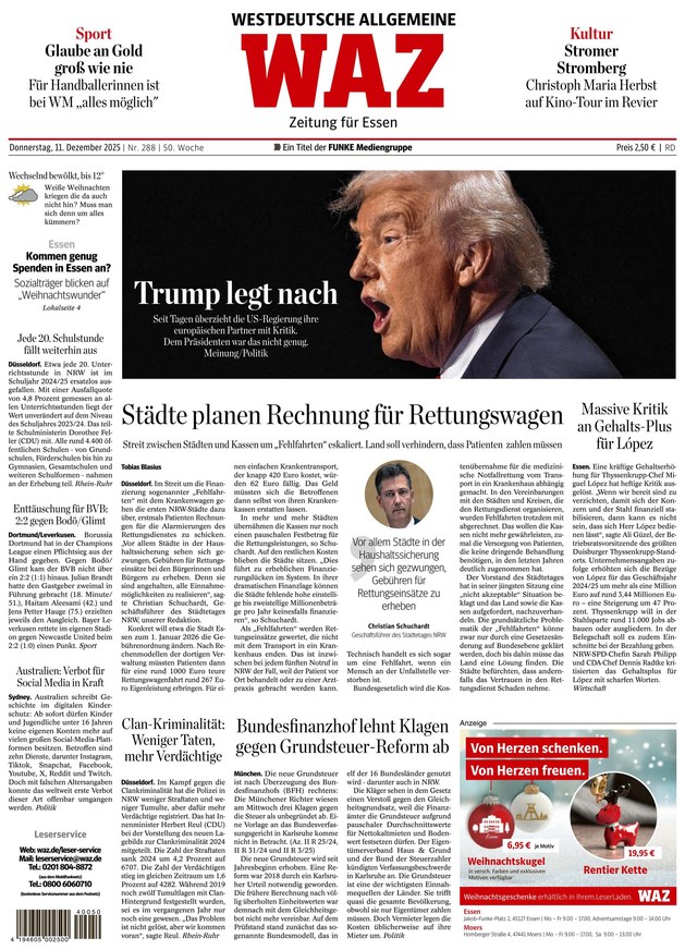 Die Westdeutsche Allgemeine Zeitung (WAZ) liefert brandaktuelle Nachrichten aus den Bereichen Politik, Wirtschaft, Kultur und Sport. Im ePaper finden Sie zudem regionale News aus Nordrhein-Westfalen. Weiterlesen...