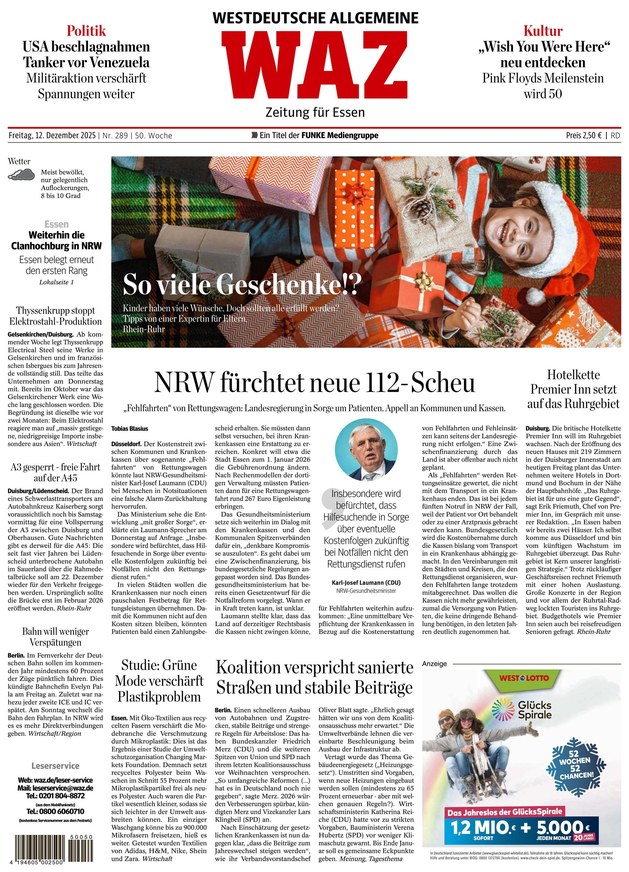 Die Westdeutsche Allgemeine Zeitung (WAZ) liefert brandaktuelle Nachrichten aus den Bereichen Politik, Wirtschaft, Kultur und Sport. Im ePaper finden Sie zudem regionale News aus Nordrhein-Westfalen. Weiterlesen...