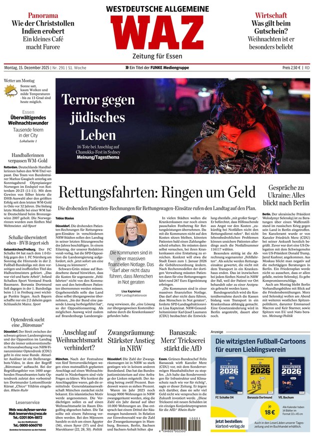 Die Westdeutsche Allgemeine Zeitung (WAZ) liefert brandaktuelle Nachrichten aus den Bereichen Politik, Wirtschaft, Kultur und Sport. Im ePaper finden Sie zudem regionale News aus Nordrhein-Westfalen. Weiterlesen...